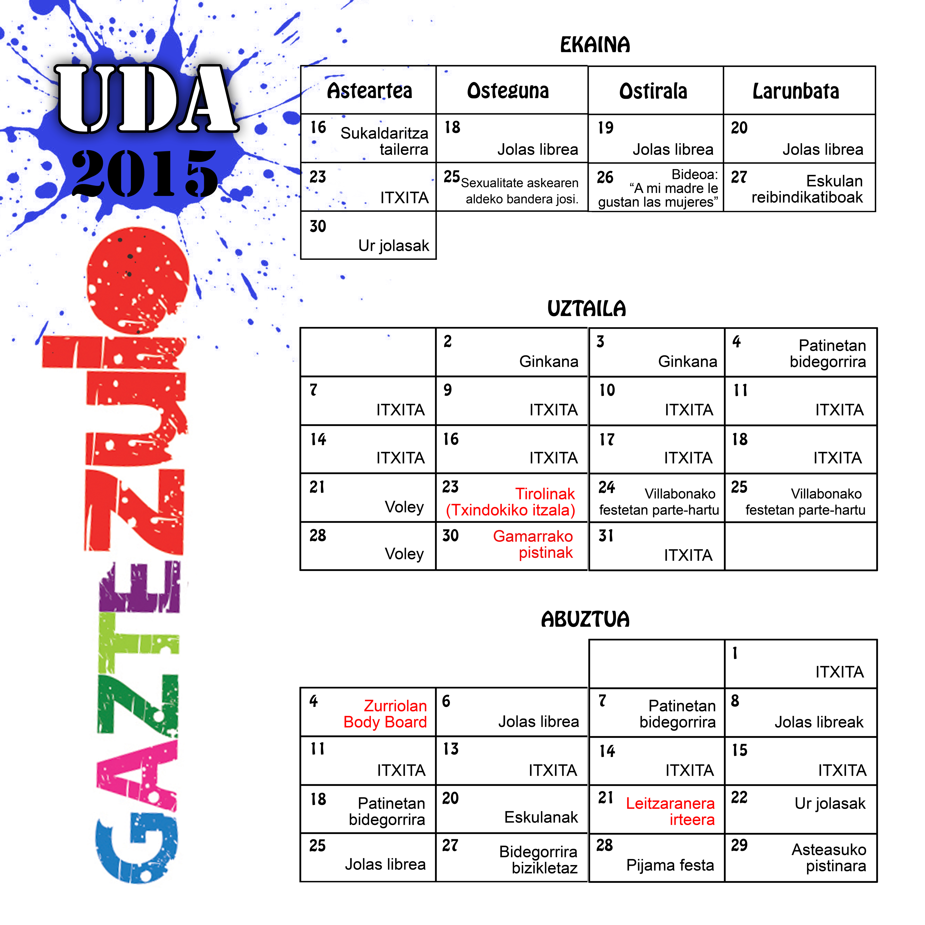 Albistearen behealdeko esku-orrian dago udako programazio osoa, egun bakoitzean egingo diren ekintzen informazioarekin. Murgildu Gaztezuloko udan!
